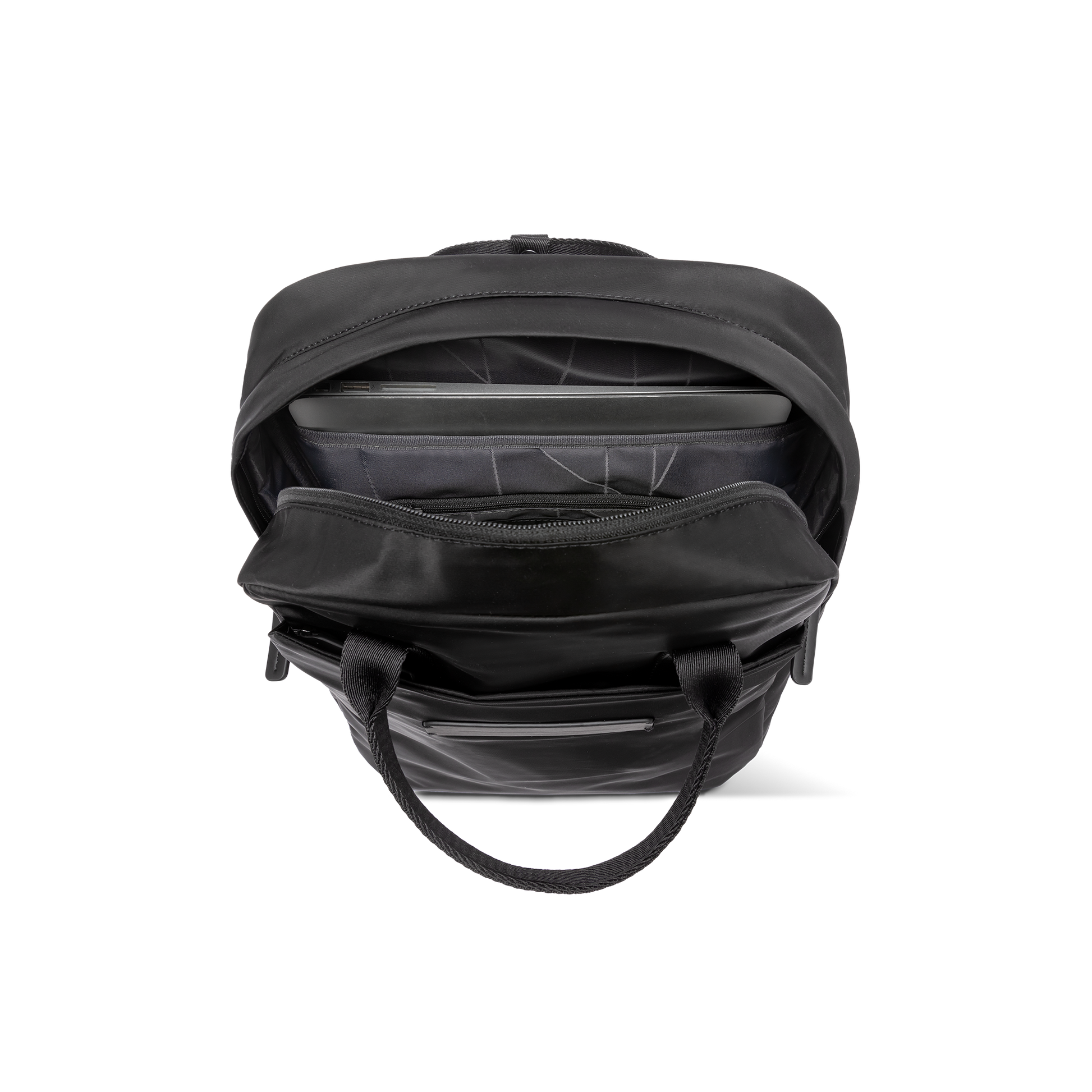 • Main opening with two sliders and top-grip handles with buttoned closure loop